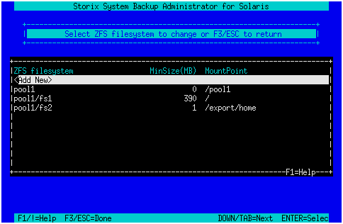 In order to migrate the / filesystem to ZFS we must change the filesystem type. Move the cursor down until the Filesystem Type field is highlighted and press F4 to list the available filesystems types. Note that the list will only include those fileystems that are supported by both the backup and the boot media.