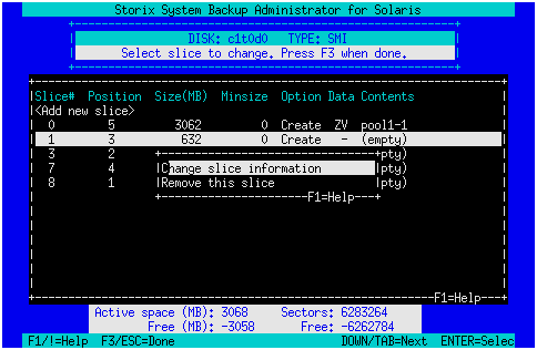 To create a new slice select Add new slice and then move to the slice above where you wish to insert the new slice. We want this new slice to be slice 0 so we press ENTER at the beginning of the table.