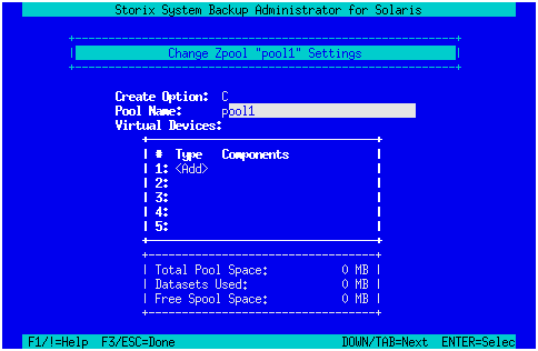 As you can see there are currently no virtual devices assigned to the pool and no pool space available. We will add our new slice (c1t0d0s0) as a virtual device to allocate storage space to the pool. Move down to the line representing virtual device #1 and select Add.